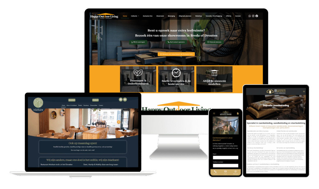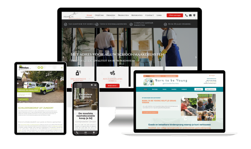 Géén templates of drie standaard ontwerpen waar we per bedrijf een ander logo boven flansen, maar een eigen ontwerp dat toegespitst is op jouw doelgroep, geoptimaliseerd is voor Google en bovenal zorgt voor een online uitstraling die recht doet aan je service, product of dienst. We bieden je een totaaloplossing, met alles in één abonnement. Snelle hosting, je domeinnaam, e-mailadressen, website met beheersysteem en een SSL certificaat, allemaal voor slechts € 35,- per maand, all-in, zonder verrassingen.